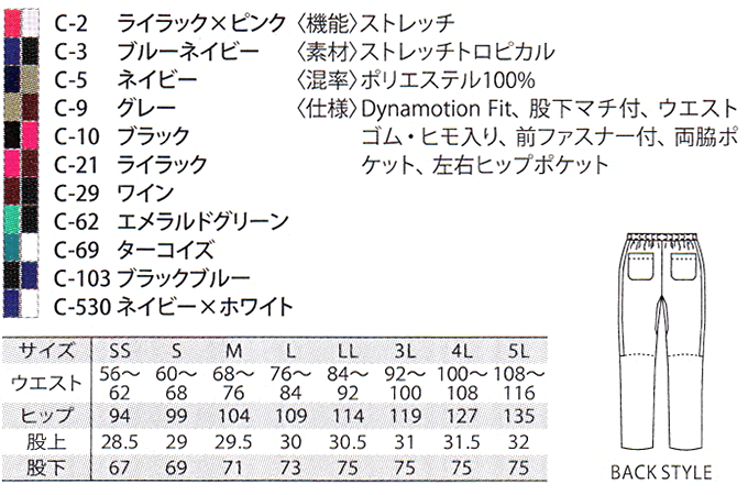 ■商品名:スクラブパンツ(兼用)■サイズ展開:SS〜5L■カラー展開:ライラック×ピンク、ブルーネイビー、ネイビー、グレー、ブラック、ライラック、ワイン、エメラルドグリーン、ターコイズ、ブラックブルー、ネイビー×ホワイト■素材:ストレッチトロピカル■混率:ポリエステル100%■仕様:Dynamotion Fit、股下マチ付、ウエストゴム・ヒモ入り、前ファスナー付、両脇ポケット、左右ヒップポケット■機能:ストレッチSize Information SS:ウエスト 56~62cm/ヒップ 94cm/股上 28.5cm/股下 67cm S:ウエスト 60~68cm/ヒップ 99cm/股上 29cm/股下 69cm M:ウエスト 68~76cm/ヒップ 104cm/股上 29.5cm/股下 71cm L:ウエスト 76~~84cm/ヒップ 109cm/股上 30cm/股下 73cm LL:ウエスト 84~92cm/ヒップ 114cm/股上 30.5cm/股下 75cm 3L:ウエスト 92~100cm/ヒップ 119cm/股上 31cm/股下 75cm 4L:ウエスト 100~108cm/ヒップ 127cm/股上 31.5cm/股下 75cm 5L:ウエスト 108~116cm/ヒップ 135cm/股上 32cm/股下 75cmCOLOR VARIATIONFUNCTIONDETAIL&SIZESIZE INFORMATION unite×MIZUNO 関連アイテムはこちら unite MIZUNO パイピング入りスクラブ(男女兼用)MZ-0090 unite MIZUNO ライン入りスクラブパンツ(男女兼用)MZ-0091