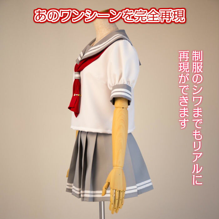 サイズ:Mサイズ 素材 :アドバンスツイル(日本メーカー製) カラー:セーラー服/白、スカート/グレー セット:セーラー服、スカート、 スカーフタイ(赤 2年生、青緑 3年生) 生産国:日本製 『ラブライブ・サンシャイン』「浦の星女学院」の女子制服・夏服の2・3年生用で、パフスリーブタイプのセーラー服になります。